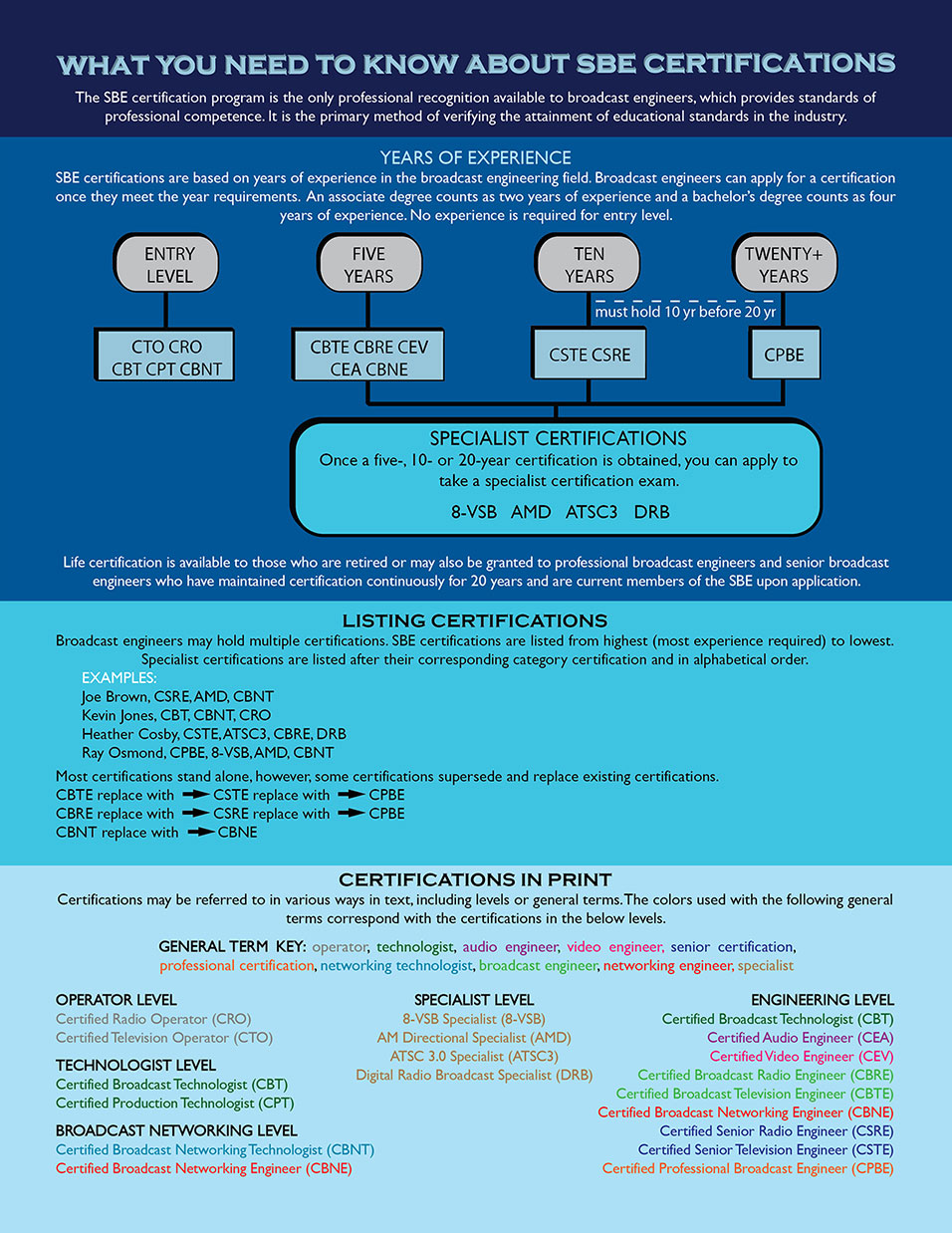 View the list of SBE Certified Schools. The schools on this list offer technical training in broadcast engineering and/or related fields. These programs have been reviewed and approved by the national SBE Certification Committee.